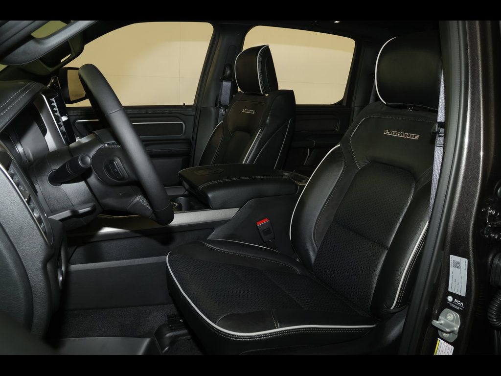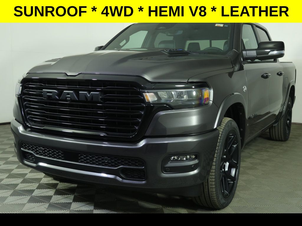 Granite Crystal Metallic Clearcoat 2026 Ram 1500 Laramie 4WD 8-Speed Automatic HEMI 5.7L V8 Multi Displacement VVT eTorque ** Adaptive Cruise Control, ** All-Wheel Drive, ** Alloy Wheels / Premium Wheels, ** Apple CarPlay/Android Auto, ** Automatic Emergency Braking, ** Backup Camera, ** Blind Spot Monitor, ** Cooled Seats, ** Cross Traffic Alert, ** Cruise Control, ** Four-Wheel Drive / 4X4, ** Heated Seats, ** Heated Steering Wheel, ** Keyless Entry, ** Keyless Start, ** Lane Departure Warning, ** Leather Seats, ** Navigation System, ** Panoramic Roof / Sunroof, ** Premium Sound System / Premium Audio, ** Rear Cross Traffic Alert, ** Remote Start, ** Satellite Radio, ** Stability Control, ** Steering Wheel Controls, ** Sunroof/Moonroof, ** Tow Hitch / Trailer Hitch, ** USB Port, ** WiFi Hotspot, 14.4" Touchscreen Display, 4-Wheel Disc Brakes, 4G LTE Wi-Fi Hot Spot, ABS brakes, Adjustable pedals, Air Conditioning, AM/FM radio: SiriusXM with 360L, Anti-Spin Differential Rear Axle, Apple CarPlay/Android Auto, Audio memory, Auto High-beam Headlights, Auto Power-Folding Mirrors, Auto-Dimming Exterior Driver Mirror, Auto-dimming Rear-View mirror, Automatic temperature control, Black Headlamp Bezels, Black Interior Accents, Body Color Front Bumper, Body Color Rear Bumper with Step Pads, Brake assist, Cluster 12" TFT Color Display, Compass, Connected Travel and Traffic Services, Connectivity - US/Canada, Convex Wide-Angle Exterior Mirror Insert, Delay-off headlights, Driver vanity mirror, Dual Exhaust with Black Tips, Dual front impact airbags, Dual front side impact airbags, Dual-Pane Panoramic Sunroof, Electronic Stability Control, Exterior Mirrors Approach Lamps, Exterior Mirrors Courtesy Lamps, Exterior Mirrors with Heating Element, Exterior Mirrors with Memory, Exterior Mirrors with Supplemental Signals, Front Bucket Seats, Front Center Armrest w/Storage, Front dual zone A/C, Front fog lights, Front Passenger Interactive Display, Front reading lights, Front wheel independent suspension, Fully automatic headlights, Garage door transmitter, GPS Navigation, Harman/Kardon 19 Speaker Premium Sound, Heated door mirrors, Heated front seats, Heated rear seats, Heated steering wheel, Illuminated entry, Integrated Center Stack Radio, Integrated Voice Command with Bluetooth, Laramie Level 2 Equipment Group, Leather steering wheel, Leather Trimmed Bucket Seats, LED Dome/Reading Lamp, Low tire pressure warning, Memory seat, MOPAR Front and Rear Rubber Floor Mats, Navigation System, Night Edition, Occupant sensing airbag, Off-Road Information Pages, Outside temperature display, Overhead console, Panic alarm, ParkView Rear Back-Up Camera, Passenger vanity mirror, Pedal memory, Pirelli Brand Tires, Power Deployable Running Boards, Power door mirrors, Power driver seat, Power passenger seat, Power Tailgate, Power windows, Proximity Approach/Departure Lamps, Quick Order Package 27H Laramie, Radio: Uconnect 5 Nav with 14.4" Display, Rain Sensitive Windshield Wipers, Rear reading lights, Rear seat center armrest, Rear step bumper, Remote keyless entry, Security system, SiriusXM Radio Service, SiriusXM with 360L, Speed control, Split folding rear seat, Sport Performance Hood, Steering wheel mounted audio controls, Tachometer, Telescoping steering wheel, Tilt steering wheel, Traction control, Trip computer, Turn signal indicator mirrors, USB Host Flip, Variably intermittent wipers, Ventilated front seats, Voltmeter, Wheels: 22" x 9" Forged Aluminum.