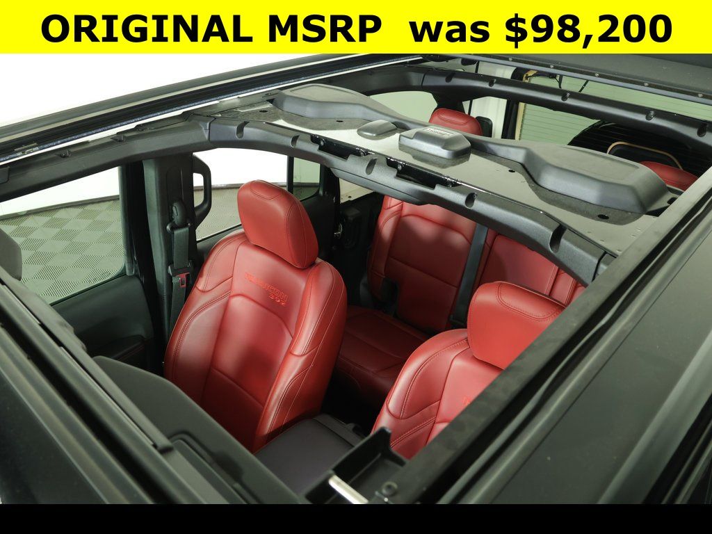 Alloy Wheels / Premium Wheels, ** Apple CarPlay/Android Auto, ** Backup Camera, ** Blind Spot Monitor, ** Cross Traffic Alert, ** Cruise Control, ** Heated Seats, ** Heated Steering Wheel, ** Keyless Entry, ** Keyless Start, ** Leather Seats, ** Navigation System, ** Panoramic Roof / Sunroof, ** Premium Sound System / Premium Audio, ** Remote Start, ** Satellite Radio, ** Stability Control, ** Steering Wheel Controls, ** Sunroof/Moonroof, ** USB Port, ** WiFi Hotspot, ** All-Wheel Drive, ** Four-Wheel Drive / 4X4, 35" Tire Rubicon 392 Suspension (DISC), 4-Wheel Disc Brakes, 9 Speakers, ABS brakes, Air Conditioning, AM/FM radio: SiriusXM with 360L, Apple CarPlay/Android Auto, Auto High-beam Headlights, Auto-dimming Rear-View mirror, Automatic temperature control, Brake assist, Compass, Convertible HardTop, Delay-off headlights, Driver vanity mirror, Dual front impact airbags, Dual front side impact airbags, Electronic Stability Control, Emergency communication system: Jeep Connect, Freedom Panel Storage Bag, Front Bucket Seats, Front dual zone A/C, Front fog lights, Front reading lights, Fully automatic headlights, Garage door transmitter, Glass rear window, Heated door mirrors, Heated front seats, Heated steering wheel, Illuminated entry, Integrated roll-over protection, Leather steering wheel, Low tire pressure warning, Nappa Leather Seats (DISC), Navigation System, Occupant sensing airbag, Outside temperature display, Panic alarm, ParkView Rear Back-Up Camera, Passenger vanity mirror, Power door mirrors, Power driver seat, Power Top Quarter Window Storage Bag, Power windows, Quick Order Package 27X Rubicon 392 (DISC), Radio data system, Radio: Uconnect 5 Nav w/12.3" Display, Rear reading lights, Rear seat center armrest, Rear Window Defroster, Rear window defroster, Rear window wiper, Rear Window Wiper/Washer, Remote keyless entry, Removable Rear Quarter Windows, Security system, Sky 1-Touch Power Top, Speed control, Split folding rear seat, Steering wheel mounted audio controls, Tilt steering wheel, Traction control, Trip computer, Variably intermittent wipers, Voltmeter, Wheels: 17" x 8" Mach/Bronze Beadlock Cap (DISC).