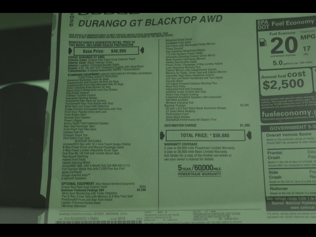PROGRESSIVE SERVICE RENTAL *** Octane Red Pearlcoat 2026 Dodge Durango GT Plus AWD 8-Speed Automatic 3.6L V6 24V VVT ** Adaptive Cruise Control, ** All-Wheel Drive, ** Alloy Wheels / Premium Wheels, ** Apple CarPlay/Android Auto, ** Backup Camera, ** Blind Spot Monitor, ** Cooled Seats, ** Cross Traffic Alert, ** Cruise Control, ** Four-Wheel Drive / 4X4, ** Heated Seats, ** Heated Steering Wheel, ** Keyless Entry, ** Keyless Start, ** Lane Departure Warning, ** Leather Seats, ** Navigation System, ** Panoramic Roof / Sunroof, ** Premium Sound System / Premium Audio, ** Rear Cross Traffic Alert, ** Remote Start, ** Satellite Radio, ** Stability Control, ** Steering Wheel Controls, ** Sunroof/Moonroof, ** Third Row Seating / 3rd Row Seating, ** USB Port, ** WiFi Hotspot, 115V Auxiliary Power Outlet, 180 Amp Alternator, 3rd row seats: split-bench, 4-Wheel Disc Brakes, 506 Watt Amplifier, 6 Speakers, ABS brakes, Advanced Brake Assist, Air Conditioning, AM/FM radio: SiriusXM w/360L, Apple CarPlay/Android Auto, Auto High Beam Headlamp Control, Auto-Dimming Exterior Driver Mirror, Auto-dimming Rear-View mirror, Automatic temperature control, Black Roof Rails, Blacktop Package, Brake assist, Bright Cargo Area Scuff Pads, Class IV Receiver Hitch, Compass, Delay-off headlights, Driver vanity mirror, Dual front impact airbags, Dual front side impact airbags, Dual Remote USB Port - Charge Only, Electronic Stability Control, Emergency communication system: Dodge Connect, Four wheel independent suspension, Front Bucket Seats, Front dual zone A/C, Front reading lights, Full Speed Forward Collision Warning Plus, Fully automatic headlights, Garage door transmitter, Heated door mirrors, Heated front seats, Heated Second Row Seats, Heated steering wheel, Heavy-Duty Engine Cooling, Illuminated entry, Integrated Roof Rail Crossbars, Knee airbag, Lane Departure Warning Plus, Leather steering wheel, Leather Trimmed Bucket Seats, Leather Wrapped Door Panels, Low tire pressure warning, Navigation System, Occupant sensing airbag, Outside temperature display, Overhead console, Panic alarm, ParkView Rear Back-Up Camera, Passenger vanity mirror, Power 6x9 Multi-Function Foldaway Mirrors, Power 8-Way Driver Memory 8-Way Passenger Seats, Power door mirrors, Power driver seat, Power Liftgate, Power Sunroof, Power windows, Quick Order Package 2BH GT Plus, Rear air conditioning, Rear Load Leveling Suspension, Rear reading lights, Rear seat center armrest, Rear window defroster, Rear window wiper, Remote keyless entry, Security Alarm, Speed control, Speed-sensing steering, Speed-Sensitive Wipers, Split folding rear seat, Sport steering wheel, Steering wheel mounted audio controls, Tachometer, Telescoping steering wheel, Tilt steering wheel, Traction control, Trailer Brake Control, Trip computer, Variably intermittent wipers, Ventilated Front Seats, Voltmeter, Wheels: 20" x 8" Black Noise Aluminum, Wireless Charging Pad.