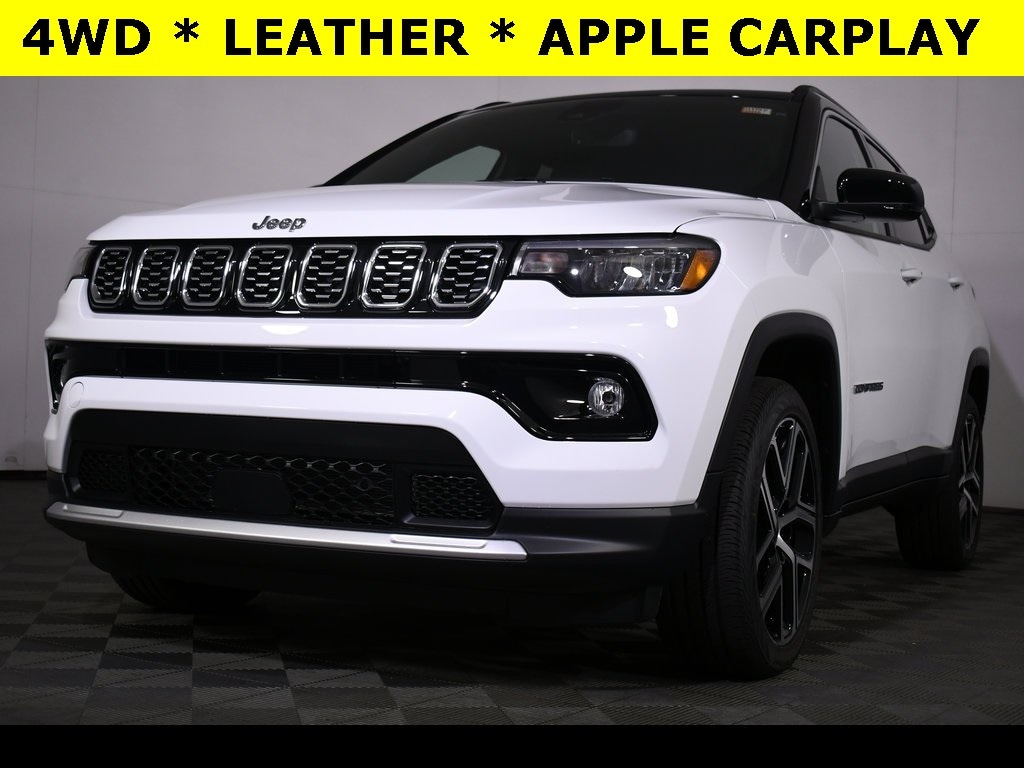 AVAILABLE PROGRESSIVE SERVICE RENTAL * Bright White Clearcoat 2025 Jeep Compass Limited 4WD 8-Speed Automatic 2.0L I4 DOHC ** Alloy Wheels / Premium Wheels, ** Apple CarPlay/Android Auto, ** Automatic Emergency Braking, ** Backup Camera, ** Blind Spot Monitor, ** Cross Traffic Alert, ** Cruise Control, ** Heated Seats, ** Heated Steering Wheel, ** Keyless Entry, ** Keyless Start, ** Lane Departure Warning, ** Leather Seats, ** Premium Sound System / Premium Audio, ** Rear Cross Traffic Alert, ** Remote Start, ** Satellite Radio, ** Stability Control, ** Steering Wheel Controls, ** USB Port, ** WiFi Hotspot, ** All-Wheel Drive, ** Four-Wheel Drive / 4X4, 10.1" Touchscreen Display, 4-Wheel Disc Brakes, 6 Speakers, ABS brakes, Air Conditioning, Alloy wheels, AM/FM radio: SiriusXM, Auto High-beam Headlights, Auto-dimming Rear-View mirror, Automatic temperature control, Brake assist, Compass, Delay-off headlights, Driver vanity mirror, Dual front impact airbags, Dual front side impact airbags, Electronic Stability Control, Emergency communication system: Jeep Connect, Four wheel independent suspension, Front Bucket Seats, Front Center Armrest w/Storage, Front dual zone A/C, Front fog lights, Front reading lights, Fully automatic headlights, Heated door mirrors, Heated front seats, Illuminated entry, Knee airbag, Leather Shift Knob, Leather steering wheel, Leatherette Seats, Low tire pressure warning, Occupant sensing airbag, Outside temperature display, Overhead console, Panic alarm, ParkView Rear Back-Up Camera, Passenger vanity mirror, Power door mirrors, Power driver seat, Power windows, Quick Order Package 29G, Radio: Uconnect 5 w/10.1" Display, Rain sensing wipers, Rear seat center armrest, Rear window defroster, Rear window wiper, Remote keyless entry, Security system, Split folding rear seat, Steering wheel mounted audio controls, Tachometer, Telescoping steering wheel, Tilt steering wheel, Traction control, Trip computer, Turn signal indicator mirrors, Variably intermittent wipers, Wheels: 19" x 7.5" Painted Diamond Cut Aluminum.