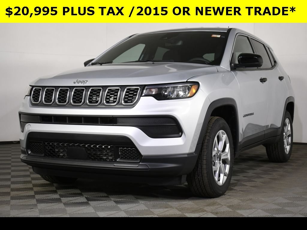 AVAILABLE PROGRESSIVE SERVICE RENTAL * Silver Zynith Metallic Clearcoat 2025 Jeep Compass Sport 4WD 8-Speed Automatic 2.0L I4 DOHC ** Alloy Wheels / Premium Wheels, ** Apple CarPlay/Android Auto, ** Automatic Emergency Braking, ** Backup Camera, ** Blind Spot Monitor, ** Cross Traffic Alert, ** Cruise Control, ** Keyless Entry, ** Lane Departure Warning, ** Premium Sound System / Premium Audio, ** Rear Cross Traffic Alert, ** Satellite Radio, ** Stability Control, ** Steering Wheel Controls, ** USB Port, ** WiFi Hotspot, ** All-Wheel Drive, ** Four-Wheel Drive / 4X4, 17" x 7" Aluminum Wheels, 4-Wheel Disc Brakes, 6 Speakers, ABS brakes, Air Conditioning, Alloy wheels, AM/FM radio: SiriusXM, Brake assist, Cloth Low-Back Bucket Seats, Compass, Delay-off headlights, Driver vanity mirror, Dual front impact airbags, Dual front side impact airbags, Electronic Stability Control, Emergency communication system: Jeep Connect, Four wheel independent suspension, Front Bucket Seats, Front Center Armrest w/Storage, Front reading lights, Fully automatic headlights, Heated door mirrors, Illuminated entry, Knee airbag, Leather steering wheel, Low tire pressure warning, Occupant sensing airbag, Outside temperature display, Overhead console, Panic alarm, ParkView Rear Back-Up Camera, Passenger vanity mirror, Power door mirrors, Power windows, Quick Order Package 29A, Radio: Uconnect 5 w/8.4" Display, Rear seat center armrest, Rear window defroster, Rear window wiper, Remote keyless entry, Security system, Speed control, Split folding rear seat, Steering wheel mounted audio controls, Tachometer, Telescoping steering wheel, Tilt steering wheel, Traction control, Trip computer, Variably intermittent wipers.