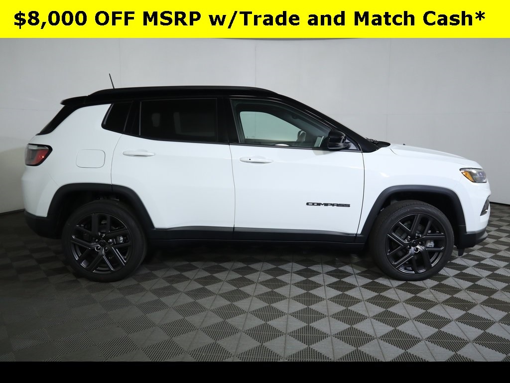 AVAILABLE PROGRESSIVE SERVICE RENTAL ** Bright White Clearcoat 2025 Jeep Compass Limited 4WD 8-Speed Automatic 2.0L I4 DOHC ** Adaptive Cruise Control, ** All-Wheel Drive, ** Alloy Wheels / Premium Wheels, ** Apple CarPlay/Android Auto, ** Automatic Emergency Braking, ** Backup Camera, ** Cross Traffic Alert, ** Cruise Control, ** Four-Wheel Drive / 4X4, ** Heated Seats, ** Heated Steering Wheel, ** Keyless Entry, ** Keyless Start, ** Lane Departure Warning, ** Leather Seats, ** Panoramic Roof / Sunroof, ** Premium Sound System / Premium Audio, ** Rear Cross Traffic Alert, ** Remote Start, ** Satellite Radio, ** Stability Control, ** Steering Wheel Controls, ** Sunroof/Moonroof, ** USB Port, ** WiFi Hotspot, 10.1" Touchscreen Display, 4-Wheel Disc Brakes, ABS brakes, Air Conditioning, AM/FM radio: SiriusXM, Auto High-beam Headlights, Auto-dimming Rear-View mirror, Automatic temperature control, Brake assist, Compass, Delay-off headlights, Driver vanity mirror, Dual front impact airbags, Dual front side impact airbags, Electronic Stability Control, Emergency communication system: Jeep Connect, Four wheel independent suspension, Front Center Armrest w/Storage, Front dual zone A/C, Front fog lights, Front reading lights, Fully automatic headlights, Heated door mirrors, Heated front seats, Illuminated entry, Knee airbag, Leather Shift Knob, Leather steering wheel, Leatherette Seats, Low tire pressure warning, Occupant sensing airbag, Outside temperature display, Overhead console, Panic alarm, ParkView Rear Back-Up Camera, Passenger vanity mirror, Power door mirrors, Power driver seat, Power Front/Fixed Rear Full Sunroof, Power windows, Premium Alpine Speaker System, Quick Order Package 29G, Radio: Uconnect 5 w/10.1" Display, Rain sensing wipers, Rear seat center armrest, Rear window defroster, Rear window wiper, Remote keyless entry, Security system, Speed control, Split folding rear seat, Steering wheel mounted audio controls, Tachometer, Telescoping steering wheel, Tilt steering wheel, Traction control, Trip computer, Turn signal indicator mirrors, Variably intermittent wipers, Wheels: 19" x 7.5" Aluminum Painted.