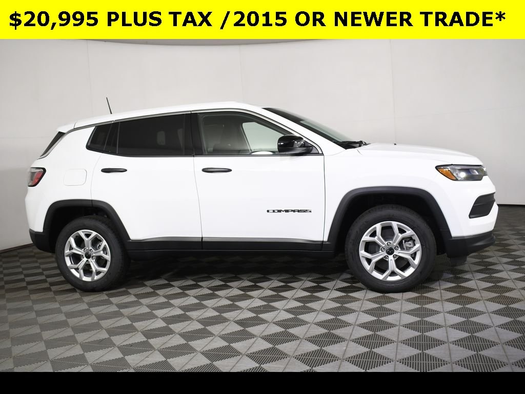 AVAILABLE PROGRESSIVE SERVICE RENTAL * Bright White Clearcoat 2025 Jeep Compass Sport 4WD 8-Speed Automatic 2.0L I4 DOHC ** Alloy Wheels / Premium Wheels, ** Apple CarPlay/Android Auto, ** Backup Camera, ** Blind Spot Monitor, ** Cross Traffic Alert, ** Cruise Control, ** Keyless Entry, ** Lane Departure Warning, ** Premium Sound System / Premium Audio, ** Satellite Radio, ** Stability Control, ** Steering Wheel Controls, ** USB Port, ** WiFi Hotspot, ** All-Wheel Drive, ** Four-Wheel Drive / 4X4, 17" x 7" Aluminum Wheels, 4-Wheel Disc Brakes, 6 Speakers, ABS brakes, Air Conditioning, Alloy wheels, AM/FM radio: SiriusXM, Brake assist, Cloth Low-Back Bucket Seats, Compass, Delay-off headlights, Driver vanity mirror, Dual front impact airbags, Dual front side impact airbags, Electronic Stability Control, Emergency communication system: Jeep Connect, Four wheel independent suspension, Front Bucket Seats, Front Center Armrest w/Storage, Front reading lights, Fully automatic headlights, Heated door mirrors, Illuminated entry, Knee airbag, Leather steering wheel, Low tire pressure warning, Occupant sensing airbag, Outside temperature display, Overhead console, Panic alarm, ParkView Rear Back-Up Camera, Passenger vanity mirror, Power door mirrors, Power windows, Quick Order Package 29A, Radio: Uconnect 5 w/8.4" Display, Rear seat center armrest, Rear window defroster, Rear window wiper, Remote keyless entry, Security system, Speed control, Split folding rear seat, Steering wheel mounted audio controls, Tachometer, Telescoping steering wheel, Traction control, Trip computer, Variably intermittent wipers.
