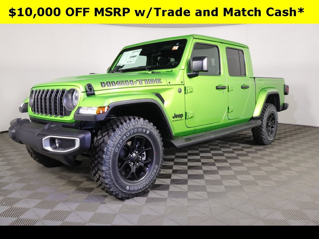 AVAILABLE PROGRESSIVE SERVICE RENTAL * 2025 Jeep Gladiator High Tide 4WD 8-Speed Automatic 3.6L V6 24V VVT 97 MPH Vehicle Max Speed Calibration, ABS brakes, Advanced Brake Assist, Automatic Headlamps, Black 3-Piece Hard Top, Body Color Fender Flares (2-Piece), Compass, Daytime Running Lamp System, Deep Tint Sunscreen Windows, Electronic Stability Control, Freedom Panel Storage Bag, Full Length Floor Console Premium Armrest, Full Speed Forward Collision Warning Plus, Hard Seat Back, High Tide, High Tide Tailgate & Hood Decals, Illuminated entry, Integrated Radar Camera Module (IRCM), Leather Wrapped Park Brake Handle, Leather Wrapped Shift Knob, Low tire pressure warning, ParkView Rear Back-Up Camera, Power 4-Way Driver Lumbar Adjust, Power 4-Way Passenger Lumbar Adjust, Power Adjust 8-Way Driver Seat, Power Adjust 8-Way Front Passenger Seat, Power Heated Mirrors, Premium Door Trim Panel, Premium McKinley Trimmed Seats, Premium Wrapped Steering Wheel, Quick Order Package 24Q High Tide, Rear Armrest w/Cupholder Seat, Rear Sliding Window, Rear Window Defroster, Remote keyless entry, Security Alarm, Sun Visors w/Illuminated Vanity Mirrors, Traction control, Wheels: 17" x 7.5" Painted Black, Willys Suspension.