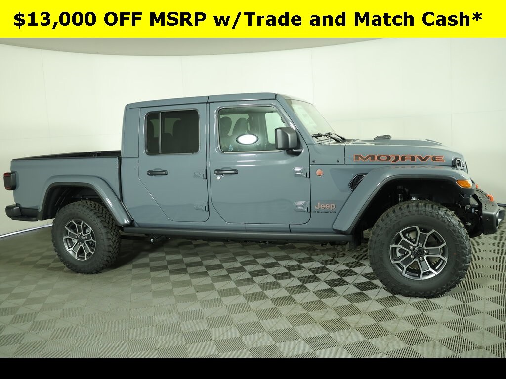 PROGRESSIVE SERVICE RENTAL ** Anvil Clearcoat 2025 Jeep Gladiator Mojave 4WD 8-Speed Automatic 3.6L V6 24V VVT ** All-Wheel Drive, ** Alloy Wheels / Premium Wheels, ** Apple CarPlay/Android Auto, ** Backup Camera, ** Blind Spot Monitor, ** Cross Traffic Alert, ** Cruise Control, ** Four-Wheel Drive / 4X4, ** Heated Seats, ** Heated Steering Wheel, ** Keyless Entry, ** Keyless Start, ** Leather Seats, ** Navigation System, ** Rear Cross Traffic Alert, ** Remote Start, ** Satellite Radio, ** Stability Control, ** Steering Wheel Controls, ** USB Port, ** WiFi Hotspot, 4-Wheel Disc Brakes, 4G LTE Wi-Fi Hot Spot, ABS brakes, Air Conditioning, Alexa Built-In, Alpine Premium Audio System, AM/FM radio: SiriusXM, Apple CarPlay/Android Auto, Auto High Beam Headlamp Control, Auto-Dimming Rear-View Mirror, Automatic temperature control, Black 3-Piece Hard Top, Blind Spot & Cross Path Detection, Bluetooth Wireless Speaker, Brake assist, Compass, Connected Travel & Traffic Services, Connectivity - US/Canada, Delay-off headlights, Driver vanity mirror, Dual front impact airbags, Dual front side impact airbags, Electronic Stability Control, Emergency communication system: Jeep Connect, Freedom Panel Storage Bag, Front dual zone A/C, Front fog lights, Front reading lights, Full Length Floor Console Premium Armrest, Fully automatic headlights, GPS Navigation, Heated door mirrors, Heated Front Seats, Heated Steering Wheel, Heavy Duty Suspension w/Gas Shocks, Illuminated entry, Integrated Off-Road Camera, Integrated roll-over protection, Integrated Voice Command w/Bluetooth, Leather Trimmed Bucket Seats, Low tire pressure warning, MOPAR All-Weather Slush Mats, MOPAR Hardtop Headliner, MOPAR Spray In Bedliner, Occupant sensing airbag, Outside temperature display, Panic alarm, ParkSense Rear Park Assist System, Passenger vanity mirror, Power Adjust 8-Way Driver Seat, Power Adjust 8-Way Front Passenger Seat, Power door mirrors, Power windows, Premium Door Trim Panel, Quick Order Package 24A Mojave X, Radio: Uconnect 5 Nav w/12.3" Display, Rear reading lights, Rear Sliding Window, Rear Window Defroster, Remote keyless entry, Security system, SiriusXM Radio Service, SiriusXM w/360L, Speed control, Split folding rear seat, Steel Front Bumper, Steel Rear Bumper, Steering wheel mounted audio controls, Tachometer, Telescoping steering wheel, Tilt steering wheel, Traction control, Trip computer, Universal Garage Door Opener, USB Host Flip, Variably intermittent wipers, Voltmeter, Wheels: 17" x 7.5" Machined/Painted Dark Gray.