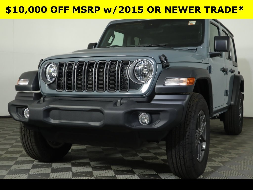 Anvil Clear Coat 2025 Jeep Wrangler Sport S 4WD 8-Speed Automatic 3.6L V6 24V VVT ** Adaptive Cruise Control, ** Alloy Wheels / Premium Wheels, ** Apple CarPlay/Android Auto, ** Backup Camera, ** Cruise Control, ** Keyless Entry, ** Premium Sound System / Premium Audio, ** Satellite Radio, ** Stability Control, ** Steering Wheel Controls, ** USB Port, ** WiFi Hotspot, ** All-Wheel Drive, ** Four-Wheel Drive / 4X4, 4-Wheel Disc Brakes, 8 Speakers, ABS brakes, Advanced Brake Assist, Air Conditioning, AM/FM radio: SiriusXM, Apple CarPlay/Android Auto, Automatic Headlamps, Aux Battery, Black 3-Piece Hard Top, Brake assist, Cloth Low-Back Bucket Seats, Compass, Corning Gorilla Glass, Deep Tint Sunscreen Windows, Delay-off headlights, Driver vanity mirror, Dual front impact airbags, Dual front side impact airbags, Electronic Stability Control, Enhanced Adaptive Cruise Control, Freedom Panel Storage Bag, Front Bucket Seats, Front fog lights, Front reading lights, Full Speed Forward Collision Warning Plus, Illuminated entry, Integrated roll-over protection, Low tire pressure warning, Non-Lock Fuel Cap w/o Discriminator, Occupant sensing airbag, Outside temperature display, Panic alarm, ParkView Rear Back-Up Camera, Passenger vanity mirror, Power Heated Mirrors, Power windows, Premium Wrapped Steering Wheel, Quick Order Package 24S Sport S, Radio data system, Radio: Uconnect 5 w/12.3" Display, Rear reading lights, Rear Window Defroster, Rear Window Wiper/Washer, Remote keyless entry, Security Alarm, Speed control, Split folding rear seat, Steering wheel mounted audio controls, Sun Visors w/Illuminated Vanity Mirrors, Tachometer, Telescoping steering wheel, Tilt steering wheel, Traction control, Trip computer, Variably intermittent wipers, Wheels: 17" x 7.5" Gray.