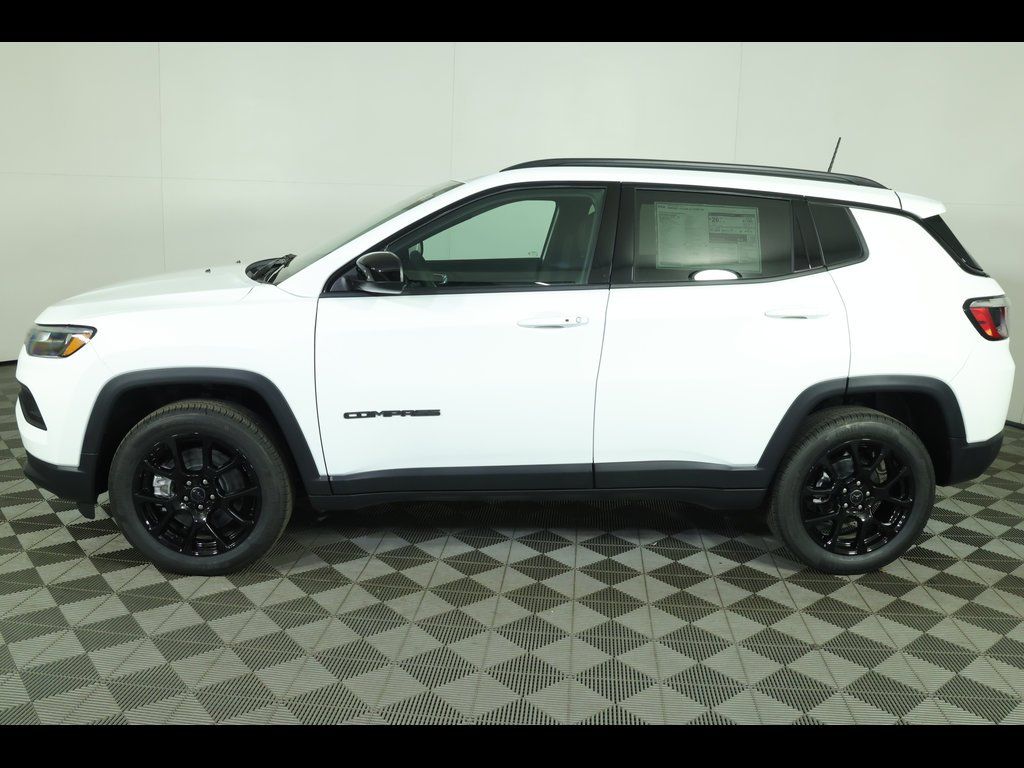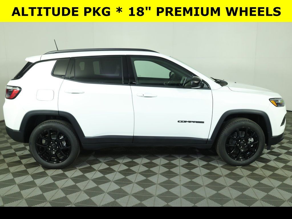 bright white clearcoat 2026 Jeep Compass Latitude 4WD 8-Speed Automatic 2.0L I4 DOHC ** All-Wheel Drive, ** Alloy Wheels / Premium Wheels, ** Apple CarPlay/Android Auto, ** Automatic Emergency Braking, ** Backup Camera, ** Blind Spot Monitor, ** Cross Traffic Alert, ** Cruise Control, ** Four-Wheel Drive / 4X4, ** Heated Seats, ** Heated Steering Wheel, ** Keyless Entry, ** Keyless Start, ** Lane Departure Warning, ** Premium Sound System / Premium Audio, ** Rear Cross Traffic Alert, ** Remote Start, ** Satellite Radio, ** Stability Control, ** Steering Wheel Controls, ** USB Port, ** WiFi Hotspot, 10.1" Touchscreen Display, 4-Wheel Disc Brakes, 4G LTE Wi-Fi Hot Spot, 6 Speakers, ABS brakes, Air Conditioning, Altitude Special Edition, AM/FM radio: SiriusXM, Auto High-beam Headlights, Automatic temperature control, Brake assist, Compass, Delay-off headlights, Driver vanity mirror, Dual front impact airbags, Dual front side impact airbags, Electronic Stability Control, Four wheel independent suspension, Front Bucket Seats, Front fog lights, Front reading lights, Fully automatic headlights, Heated door mirrors, Heated front seats, Heated steering wheel, Illuminated entry, Knee airbag, Leather Shift Knob, Leather steering wheel, Low tire pressure warning, Occupant sensing airbag, Outside temperature display, Overhead console, Panic alarm, ParkView Rear Back-Up Camera, Passenger vanity mirror, Power windows, Premium Cloth/Vinyl Bucket Seats, Premium LED Fog Lamps, Quick Order Package 29N Altitude, Rear seat center armrest, Rear window defroster, Rear window wiper, Remote keyless entry, Security system, SiriusXM Satellite Radio, Speed control, Split folding rear seat, Steering wheel mounted audio controls, Tachometer, Telescoping steering wheel, Tilt steering wheel, Traction control, Trip computer, Variably intermittent wipers, Wheels: 18" x 7" Gloss Black Painted Aluminum.