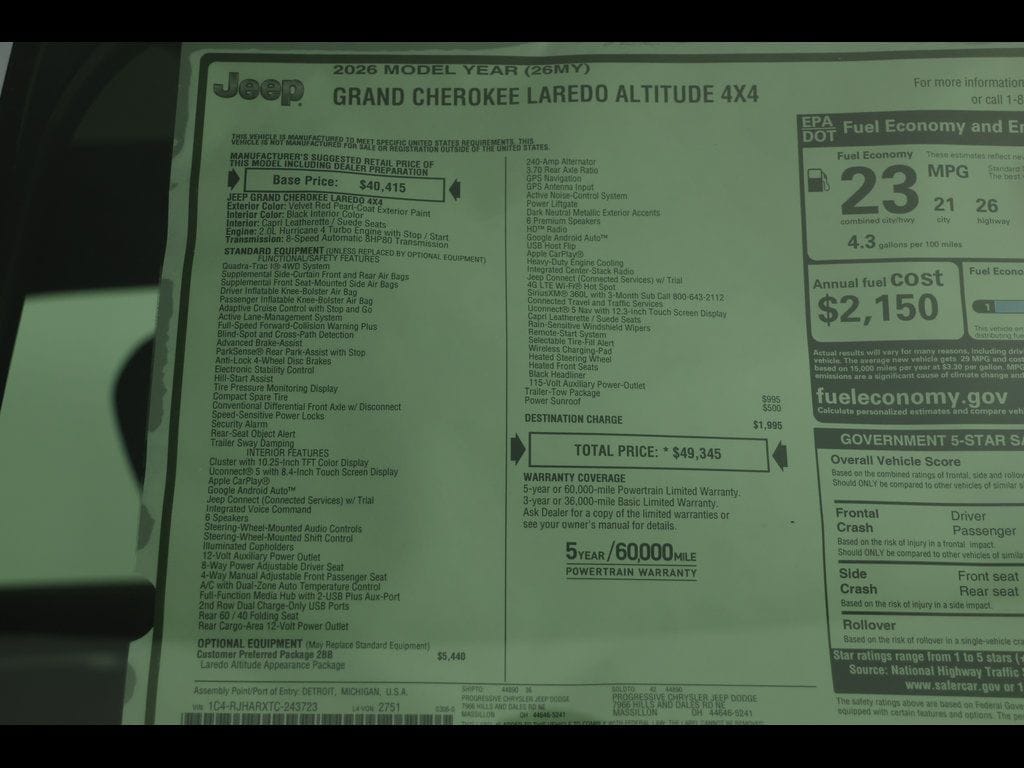 PROGRESSIVE SERVICE RENTAL ** Velvet Red Pearlcoat 2026 Jeep Grand Cherokee Laredo Altitude 4WD 8-Speed Automatic 2.0L Hurricane 4 Turbo with ESS ** Adaptive Cruise Control, ** All-Wheel Drive, ** Alloy Wheels / Premium Wheels, ** Apple CarPlay/Android Auto, ** Automatic Emergency Braking, ** Backup Camera, ** Blind Spot Monitor, ** Cross Traffic Alert, ** Cruise Control, ** Four-Wheel Drive / 4X4, ** Heated Seats, ** Heated Steering Wheel, ** Keyless Entry, ** Keyless Start, ** Lane Departure Warning, ** Leather Seats, ** Navigation System, ** Panoramic Roof / Sunroof, ** Premium Sound System / Premium Audio, ** Rear Cross Traffic Alert, ** Remote Start, ** Satellite Radio, ** Stability Control, ** Steering Wheel Controls, ** Sunroof/Moonroof, ** USB Port, ** WiFi Hotspot, 115V Auxiliary Power Outlet, 240 Amp Alternator, 3.70 Rear Axle Ratio, 4-Wheel Disc Brakes, 4G LTE Wi-Fi Hot Spot, 7 and 4-Pin Wiring Harness, ABS brakes, Active Driving Assist System, Active Noise Control System, Air Conditioning, AM/FM radio: SiriusXM, Anti-whiplash front head restraints, AppLink/Apple CarPlay and Android Auto, Automatic temperature control, Black Headliner, Brake assist, Capri Leatherette/Suede Seats, Class IV Receiver Hitch, Compass, Connected Travel and Traffic Services, Connectivity - US/Canada, Delay-off headlights, Disassociated Touchscreen Display, Driver vanity mirror, Dual Exhaust Tips, Dual front impact airbags, Dual front side impact airbags, Electronic Stability Control, Emergency communication system, Exterior Accents Dark Neutral Metallic, Four wheel independent suspension, Front Bucket Seats, Front Center Armrest w/Storage, Front dual zone A/C, Front reading lights, Fully automatic headlights, Global Telematics Box Module (TBM), Google Android Auto, GPS Antenna Input, GPS Navigation, HD Radio, Heated Exterior Mirrors, Heated Front Seats, Heated Steering Wheel, Heavy-Duty Engine Cooling, Illuminated entry, Integrated Center Stack Radio, Integrated Voice Command with Bluetooth, Intersection Collision Assist System, Knee airbag, Laredo Altitude Appearance Package, Low tire pressure warning, Occupant sensing airbag, Outside temperature display, Overhead console, Panic alarm, ParkView Rear Back-Up Camera, Passenger vanity mirror, Power door mirrors, Power driver seat, Power Liftgate, Power Sunroof, Power windows, Quick Order Package 2BB Laredo Altitude, Radio: Uconnect 5 Nav with 12.3" Display, Rain Sensitive Windshield Wipers, Rear Load Levelling Suspension, Rear reading lights, Rear window defroster, Rear window wiper, Remote keyless entry, Secondary Active Grille Shutters, Security system, Selec-Terrain System, Selectable Tire Fill Alert, SiriusXM with 360L, Speed control, Speed-Sensitive Wipers, Split folding rear seat, Steering wheel mounted audio controls, Tachometer, Telescoping steering wheel, Tilt steering wheel, Traction control, Traffic Sign Recognition, Trailer Hitch Zoom, Trailer Tow Package, Trip computer, USB Host Flip, Variably intermittent wipers, Voltmeter, Wheels: 18" x 8.0" Fully Painted Aluminum 1, Wireless Charging Pad.