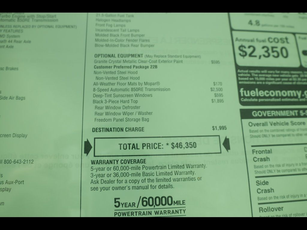 Granite Crystal Metallic Clearcoat 2026 Jeep Wrangler Sport 4WD 8-Speed Automatic 2.0L I4 DOHC ** All-Wheel Drive, ** Alloy Wheels / Premium Wheels, ** Apple CarPlay/Android Auto, ** Backup Camera, ** Cruise Control, ** Four-Wheel Drive / 4X4, ** Keyless Entry, ** Premium Sound System / Premium Audio, ** Satellite Radio, ** Stability Control, ** Steering Wheel Controls, ** USB Port, ** WiFi Hotspot, 4-Wheel Disc Brakes, 4G LTE Wi-Fi Hot Spot, 8 Speakers, ABS brakes, Air Conditioning, AM/FM radio: SiriusXM with 360L, Apple CarPlay/Android Auto, Black 3-Piece Hard Top, Black 3-Piece Hard Top, Brake assist, Compass, Deep Tint Sunscreen Windows, Delay-off headlights, Driver vanity mirror, Dual front impact airbags, Dual front side impact airbags, Electronic Stability Control, Freedom Panel Storage Bag, Front Bucket Seats, Front Center Armrest w/Storage, Front fog lights, Front reading lights, Google Android Auto, Illuminated entry, Integrated Center Stack Radio, Integrated roll-over protection, Low tire pressure warning, MOPAR All-Weather Floor Mats, Non-Lock Fuel Cap Without Discriminator, Occupant sensing airbag, Outside temperature display, Panic alarm, ParkView Rear Back-Up Camera, Passenger vanity mirror, Power windows, Quick Order Package 22B Sport, Radio data system, Radio: Uconnect 5 with 12.3" Display, Rear reading lights, Rear Window Defroster, Rear Window Wiper/Washer, Remote keyless entry, SiriusXM Radio Service, SiriusXM with 360L, Speed control, Split folding rear seat, Steering wheel mounted audio controls, Stop-Start Dual Battery System, Tachometer, Telescoping steering wheel, Tilt steering wheel, Traction control, Trip computer, Variably intermittent wipers, Wheels: 17" x 7.5" Black Steel Styled.