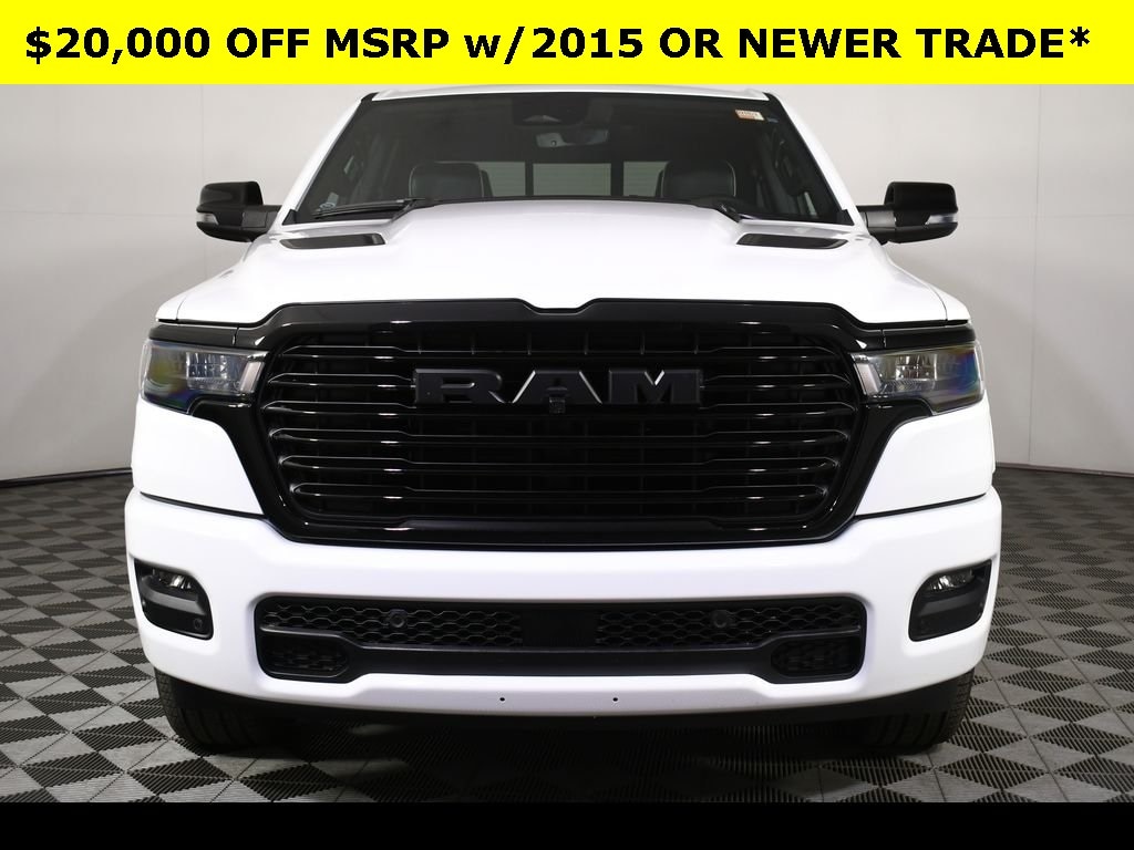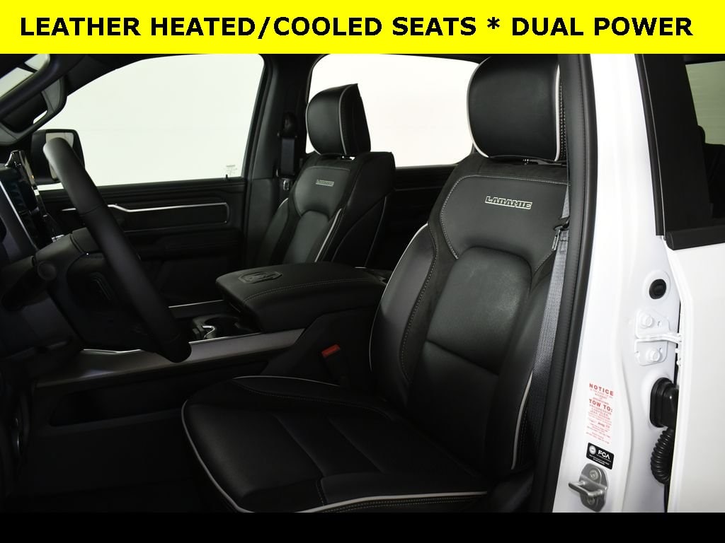 Bright White Clearcoat 2025 Ram 1500 Laramie Night Edition 4WD 8-Speed Automatic 3.0L I6 ** Adaptive Cruise Control, ** Alloy Wheels / Premium Wheels, ** Apple CarPlay/Android Auto, ** Automatic Emergency Braking, ** Backup Camera, ** Blind Spot Monitor, ** Cooled Seats, ** Cross Traffic Alert, ** Cruise Control, ** Heated Seats, ** Heated Steering Wheel, ** Keyless Entry, ** Keyless Start, ** Lane Departure Warning, ** Leather Seats, ** Navigation System, ** Premium Sound System / Premium Audio, ** Rear Cross Traffic Alert, ** Remote Start, ** Satellite Radio, ** Stability Control, ** Steering Wheel Controls, ** Tow Hitch / Trailer Hitch, ** USB Port, ** WiFi Hotspot, ** All-Wheel Drive, ** Four-Wheel Drive / 4X4, #1 Seat Foam Cushion, 14.4" Touchscreen Display, 3 Rear Seat Head Restraints, 4 Way Front Headrests, 4-Wheel Disc Brakes, 4G LTE Wi-Fi Hot Spot, ABS brakes, Accent Color Door Handles, Accent Color Premium Power Mirrors, Accent Color Tailgate Handle, Air Conditioning, Alloy wheels, AM/FM radio: SiriusXM with 360L, Anti-Spin Differential Rear Axle, Apple CarPlay/Android Auto, Auto High-beam Headlights, Auto Power-Folding Mirrors, Auto-dimming door mirrors, Auto-Dimming Exterior Driver Mirror, Auto-dimming Rear-View mirror, Automatic temperature control, Black Exterior Truck Badging, Black Headlamp Bezels, Black Interior Accents, Black Painted Exterior Mirrors Caps, Black Tail Lamp Bezels, Body Color Front Bumper, Body Color Rear Bumper w/Step Pads, Brake assist, Bucket Seats, Center Console Parts Module, Cluster 12" TFT Color Display, Connected Travel & Traffic Services, Connectivity - US/Canada, Convex Wide-Angle Exterior Mirror Insert, Delay-off headlights, Driver Seat Memory, Driver vanity mirror, Dual Exhaust w/Black Tips, Dual front impact airbags, Dual front side impact airbags, Electronic Stability Control, Exterior Mirrors Approach Lamps, Exterior Mirrors Courtesy Lamps, Exterior Mirrors w/Heating Element, Exterior Mirrors w/Memory, Exterior Mirrors w/Supplemental Signals, Front Center Armrest w/Storage, Front dual zone A/C, Front fog lights, Front Seat Back Map Pockets, Front wheel independent suspension, Full Length Upgraded Floor Console, Fully automatic headlights, Google Android Auto, GPS Antenna Input, GPS Navigation, Grille Surround 3 Black Texture 2 Black, harman/kardon 19 Speaker Premium Sound, HD Radio, Heated door mirrors, Heated Front Seats, Heated rear seats, Heated Second Row Seats, Heated Steering Wheel, Illuminated entry, Integrated Voice Command w/Bluetooth, Laramie Level 2 Equipment Group, Leather steering wheel, Leather Trimmed Bucket Seats, Low tire pressure warning, Memory seat, MOPAR Front & Rear Rubber Floor Mats, Night Edition, Occupant sensing airbag, Outside temperature display, Overhead console, Panic alarm, ParkView Rear Back-Up Camera, Passenger vanity mirror, Pirelli Brand Tires, Power 2-Way Driver Lumbar Adjust, Power 2-Way Passenger Lumbar Adjust, Power Adjust 8-Way Driver Seat, Power Adjust 8-Way Front Passenger Seat, Power door mirrors, Power driver seat, Power passenger seat, Power Tailgate, Power windows, Proximity Approach/Departure Lamps, Quick Order Package 21H Laramie, Radio data system, Radio: Uconnect 5 Nav w/14.4" Display, Rain Sensitive Windshield Wipers, RAM Grille Badge - Black, Rear 60/40 Folding Split Recline Seat, Rear reading lights, Rear seat center armrest, Rear step bumper, Remote keyless entry, Security system, SiriusXM w/360L, Speed control, Split folding rear seat, Sport Performance Hood, Steering wheel mounted audio controls, Tachometer, Telescoping steering wheel, Tilt steering wheel, Traction control, Trip computer, Turn signal indicator mirrors, USB Host Flip, Variably intermittent wipers, Ventilated Front Seats, Wheels: 22" x 9" Forged Aluminum.