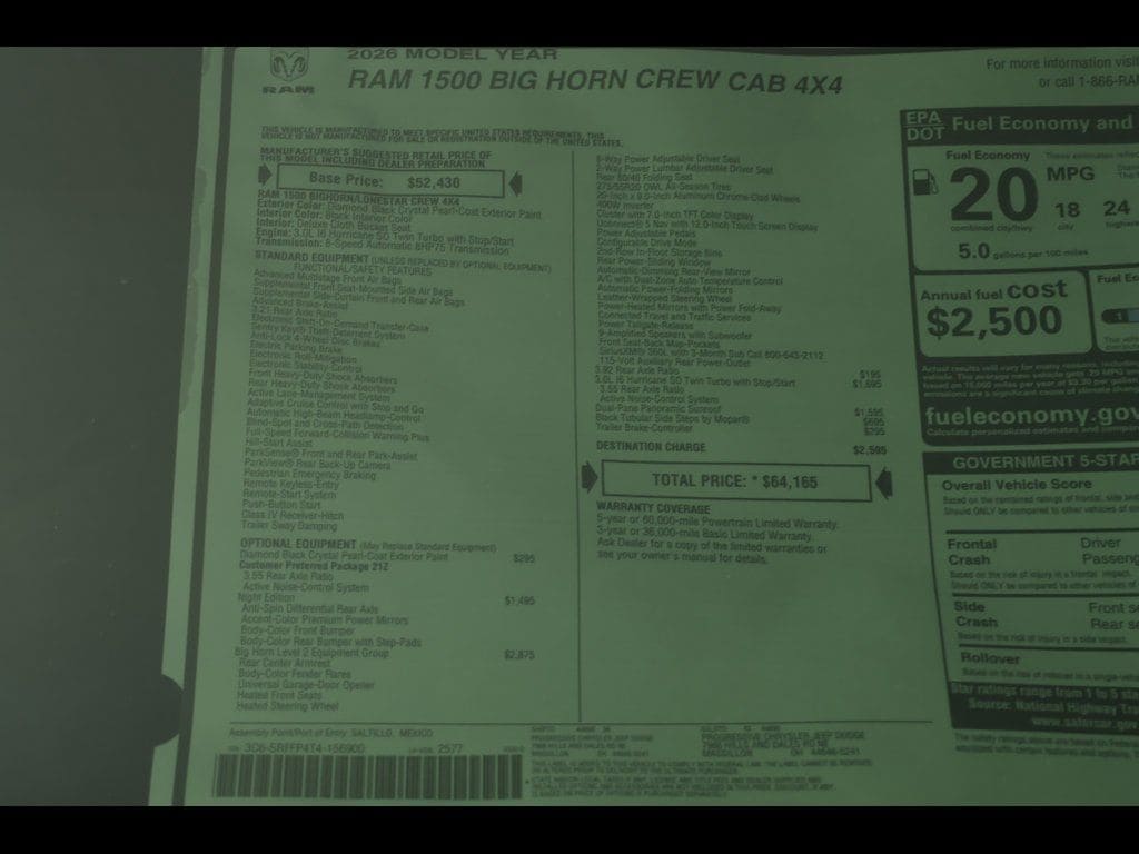 * Just Sold * AVAILABLE PROGRESSIVE SERVICE RENTAL ** Diamond Black Crystal Pearlcoat 2026 Ram 1500 Big Horn/Lone Star 4WD 8-Speed Automatic 3.0L I6 ** Adaptive Cruise Control, ** All-Wheel Drive, ** Alloy Wheels / Premium Wheels, ** Apple CarPlay/Android Auto, ** Automatic Emergency Braking, ** Backup Camera, ** Brake Assist, ** Cross Traffic Alert, ** Cruise Control, ** Four-Wheel Drive / 4X4, ** Heated Seats, ** Heated Steering Wheel, ** Keyless Entry, ** Keyless Start, ** Lane Departure Warning, ** Navigation System, ** Panoramic Roof / Sunroof, ** Premium Sound System / Premium Audio, ** Rear Cross Traffic Alert, ** Remote Start, ** Satellite Radio, ** Stability Control, ** Steering Wheel Controls, ** Sunroof/Moonroof, ** Tow Hitch / Trailer Hitch, ** USB Port, ** WiFi Hotspot, 115V Auxiliary Power Outlet, 115V Auxiliary Rear Power Outlet, 4-Wheel Disc Brakes, 400W Inverter, 4G LTE Wi-Fi Hot Spot, 9 Amplified Speakers with Subwoofer, ABS brakes, Air Conditioning, Air Conditioning ATC with Dual Zone Control, AM/FM radio, Anti-Spin Differential Rear Axle, Apple CarPlay/Android Auto, Auto High-beam Headlights, Auto-Dimming Exterior Driver Mirror, Auto-Dimming Rear-View Mirror, Big Horn Level 2 Equipment Group, Black Headlamp Bezels, Body Color Fender Flares, Body Color Front Bumper, Body Color Rear Bumper with Step Pads, Brake assist, Cloth Bucket Seats, Configurable Drive Mode, Connected Travel and Traffic Services, Connectivity - US/Canada, Convex Wide-Angle Exterior Mirror Insert, Deluxe Cloth Bucket Seats, Disassociated Touchscreen Display, Dual Exhaust with Black Tips, Dual front impact airbags, Dual front side impact airbags, Dual-Pane Panoramic Sunroof, Electronic Stability Control, Exterior Mirrors Courtesy Lamps, Exterior Mirrors with Supplemental Signals, Front Seat Back Map Pockets, Front wheel independent suspension, GPS Antenna Input, GPS Navigation, HD Radio, Heated door mirrors, Heated Front Seats, Heated Steering Wheel, Illuminated entry, Integrated Center Stack Radio, Integrated Voice Command with Bluetooth, Leather Wrapped Steering Wheel, LED Dome Lamp with on/Off Switch, Low tire pressure warning, Media Hub with 2 Charge Only USBs, Mopar Black Tubular Side Steps, Night Edition, Occupant sensing airbag, Outside temperature display, Overhead console, Overhead LED Lamps, ParkView Rear Back-Up Camera, Passenger vanity mirror, Power Adjust 8-Way Driver Seat, Power Adjustable Pedals, Power door mirrors, Power windows, Premium Overhead Console, Quick Order Package 21Z Big Horn, Radio: Uconnect 5 Navigation with 12.0" Display, Rear 60/40 Folding Seat, Rear Center Armrest, Rear Power Sliding Window, Rear step bumper, Rear Wheelhouse Liners, Rear Window Defroster, Remote keyless entry, Remote Tailgate Release, Security Alarm, SiriusXM Radio Service, SiriusXM with 360L, Steering Wheel Mounted Audio Controls, Sun Visors with Illuminated Vanity Mirrors, Tachometer, Telescoping steering wheel, Tilt steering wheel, Traction control, Trip computer, Universal Garage Door Opener, USB Host Flip, Variably intermittent wipers, Voltmeter, Wheels: 20" x 9.0" Aluminum Painted Clad.