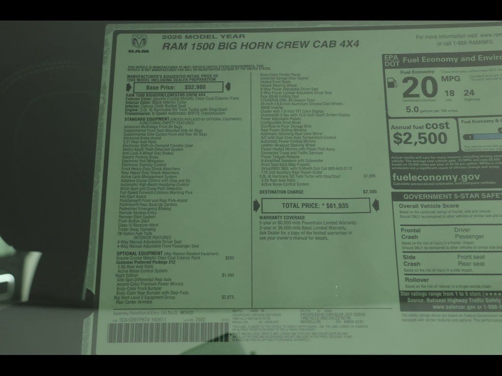 Granite Crystal Metallic Clearcoat 2026 Ram 1500 Big Horn/Lone Star 4WD 8-Speed Automatic 3.0L I6 ** All-Wheel Drive, ** Alloy Wheels / Premium Wheels, ** Apple CarPlay/Android Auto, ** Automatic Emergency Braking, ** Backup Camera, ** Blind Spot Monitor, ** Cross Traffic Alert, ** Cruise Control, ** Four-Wheel Drive / 4X4, ** Heated Seats, ** Heated Steering Wheel, ** Keyless Entry, ** Keyless Start, ** Lane Departure Warning, ** Navigation System, ** Premium Sound System / Premium Audio, ** Rear Cross Traffic Alert, ** Remote Start, ** Satellite Radio, ** Stability Control, ** Steering Wheel Controls, ** Tow Hitch / Trailer Hitch, ** USB Port, ** WiFi Hotspot, 115V Auxiliary Power Outlet, 115V Auxiliary Rear Power Outlet, 12" Touchscreen Display, 2nd Row in Floor Storage Bins, 4-Wheel Disc Brakes, 400W Inverter, 4G LTE Wi-Fi Hot Spot, 9 Amplified Speakers with Subwoofer, ABS brakes, Air Conditioning, Air Conditioning ATC with Dual Zone Control, AM/FM radio, Anti-Spin Differential Rear Axle, Apple CarPlay/Android Auto, Auto High-beam Headlights, Auto Power-Folding Mirrors, Auto-Dimming Exterior Driver Mirror, Auto-Dimming Rear-View Mirror, Big Horn Level 2 Equipment Group, Black Headlamp Bezels, Black Interior Accents, Black Premium Power Mirrors, Body Color Fender Flares, Body Color Front Bumper, Body Color Rear Bumper with Step Pads, Brake assist, Center Console Parts Module, Cloth Bucket Seats, Compass, Configurable Drive Mode, Connected Travel and Traffic Services, Connectivity - US/Canada, Convex Wide-Angle Exterior Mirror Insert, Delay-off headlights, Deluxe Cloth Bucket Seats, Disassociated Touchscreen Display, Dual Exhaust with Black Tips, Dual front impact airbags, Dual front side impact airbags, Electronic Stability Control, Exterior Mirrors Courtesy Lamps, Exterior Mirrors with Heating Element, Exterior Mirrors with Supplemental Signals, Front Center Armrest w/Storage, Front fog lights, Front reading lights, Front Seat Back Map Pockets, Front wheel independent suspension, Full Length Floor Console, Fully automatic headlights, Global Telematics Box Module, Glove Box Lamp, GPS Antenna Input, GPS Navigation, Grille Black Surround Black Mesh, HD Radio, Heated door mirrors, Heated Front Seats, Heated Steering Wheel, Integrated Center Stack Radio, Integrated Voice Command with Bluetooth, Leather Wrapped Steering Wheel, LED Dome Lamp with on/Off Switch, LED Footwell Lighting, Low tire pressure warning, Manual Folding Exterior Mirrors, Media Hub with 2 Charge Only USBs, Night Edition, Occupant sensing airbag, Outside temperature display, Overhead console, Overhead LED Lamps, Panic alarm, ParkView Rear Back-Up Camera, Passenger vanity mirror, Power Adjust 8-Way Driver Seat, Power Adjustable Pedals, Power door mirrors, Power windows, Premium Overhead Console, Quick Order Package 21Z Big Horn, Radio: Uconnect 5 Navigation with 12.0" Display, RAM Grille Badge - Black, Rear 60/40 Folding Seat, Rear Power Sliding Window, Rear step bumper, Rear Window Defroster, Remote keyless entry, Remote Tailgate Release, Security Alarm, SiriusXM Radio Service, SiriusXM with 360L, Speed control, Steering Wheel Mounted Audio Controls, Sun Visors with Illuminated Vanity Mirrors, Tachometer, Telescoping steering wheel, Tilt steering wheel, Traction control, Trip computer, Universal Garage Door Opener, USB Host Flip, Variably intermittent wipers, Voltmeter, Wheels: 20" x 9.0" Aluminum Painted Clad.