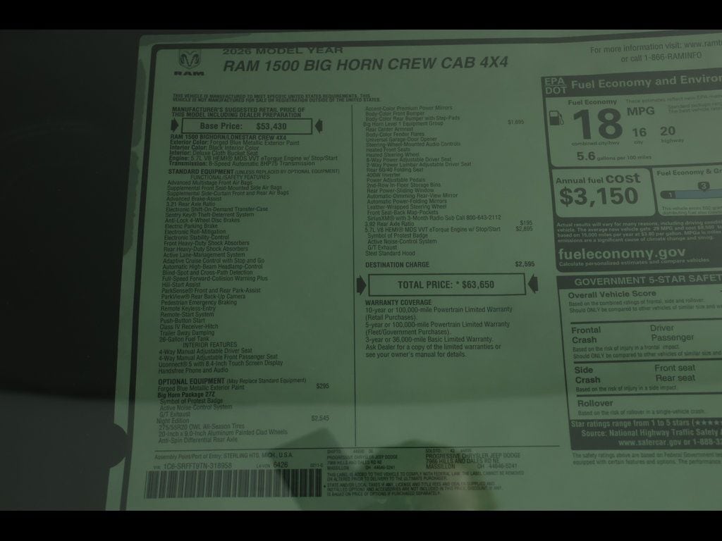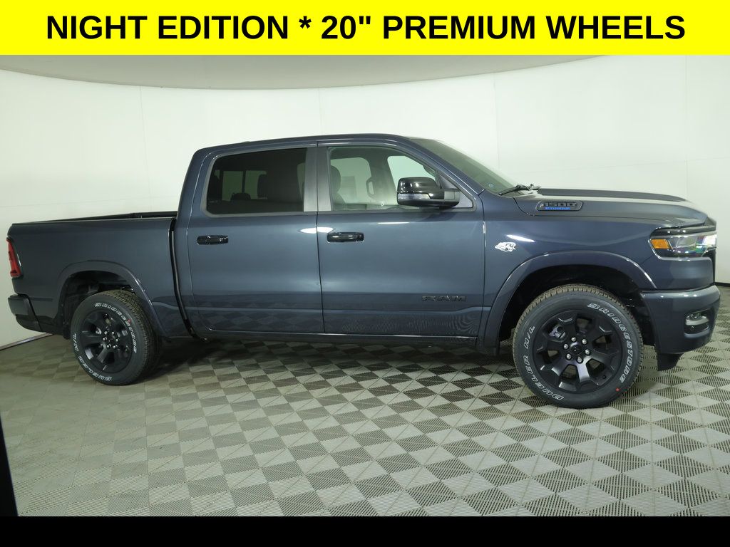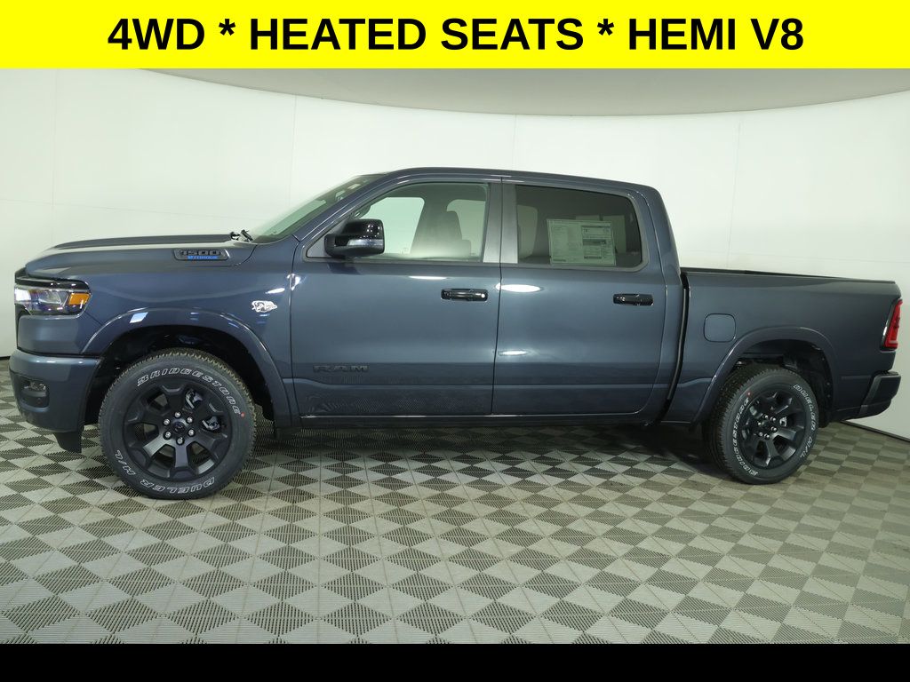 PROGRESSIVE SERVICE RENTAL ** Forged Blue Metallic 2026 Ram 1500 Big Horn/Lone Star 4WD 8-Speed Automatic HEMI 5.7L V8 Multi Displacement VVT eTorque ** Adaptive Cruise Control, ** All-Wheel Drive, ** Alloy Wheels / Premium Wheels, ** Apple CarPlay/Android Auto, ** Automatic Emergency Braking, ** Backup Camera, ** Blind Spot Monitor, ** Cross Traffic Alert, ** Cruise Control, ** Four-Wheel Drive / 4X4, ** Heated Seats, ** Heated Steering Wheel, ** Keyless Entry, ** Keyless Start, ** Lane Departure Warning, ** Premium Sound System / Premium Audio, ** Rear Cross Traffic Alert, ** Remote Start, ** Satellite Radio, ** Stability Control, ** Steering Wheel Controls, ** Tow Hitch / Trailer Hitch, ** USB Port, ** WiFi Hotspot, 115V Auxiliary Power Outlet, 2nd Row in Floor Storage Bins, 4-Wheel Disc Brakes, 400W Inverter, 4G LTE Wi-Fi Hot Spot, 6 Speakers, ABS brakes, Air Conditioning, AM/FM radio, Anti-Spin Differential Rear Axle, Apple CarPlay/Android Auto, Auto High-beam Headlights, Auto Power-Folding Mirrors, Auto-Dimming Exterior Driver Mirror, Auto-Dimming Rear-View Mirror, Big Horn Level 1 Equipment Group, Black Headlamp Bezels, Black Interior Accents, Body Color Fender Flares, Cloth Bench Seat, Cloth Bucket Seats, Compass, Convex Wide-Angle Exterior Mirror Insert, Delay-off headlights, Deluxe Cloth Bucket Seats, Dual Exhaust with Black Tips, Dual front impact airbags, Dual front side impact airbags, Exterior Mirrors Courtesy Lamps, Exterior Mirrors with Heating Element, Exterior Mirrors with Supplemental Signals, Front Center Armrest w/Storage, Front fog lights, Front reading lights, Front Seat Back Map Pockets, Front wheel independent suspension, Full Length Floor Console, Fully automatic headlights, Global Telematics Box Module, Glove Box Lamp, Google Android Auto, GPS Antenna Input, Heated door mirrors, Heated Front Seats, Heated Steering Wheel, Illuminated entry, Integrated Center Stack Radio, Integrated Voice Command with Bluetooth, Leather Wrapped Steering Wheel, Low tire pressure warning, Night Edition, Occupant sensing airbag, Outside temperature display, Overhead console, Panic alarm, ParkView Rear Back-Up Camera, Passenger vanity mirror, Power Adjust 8-Way Driver Seat, Power Adjustable Pedals, Power door mirrors, Power windows, Quick Order Package 27Z Big Horn, Radio: Uconnect 5 W with 8.4" Display, Rear 60/40 Folding Seat, Rear Center Armrest, Rear Dome with on/Off Switch Lamp, Rear Power Sliding Window, Rear step bumper, Rear Window Defroster, Remote keyless entry, Seat Parts Module II, SiriusXM Radio Service, SiriusXM Satellite Radio, Speed control, Steering Wheel Mounted Audio Controls, Sun Visors with Illuminated Vanity Mirrors, Tachometer, Telescoping steering wheel, Tilt steering wheel, Traction control, Trip computer, Universal Garage Door Opener, USB Host Flip, Variably intermittent wipers, Voltmeter, Wheels: 20" x 9.0" Aluminum Painted Clad.