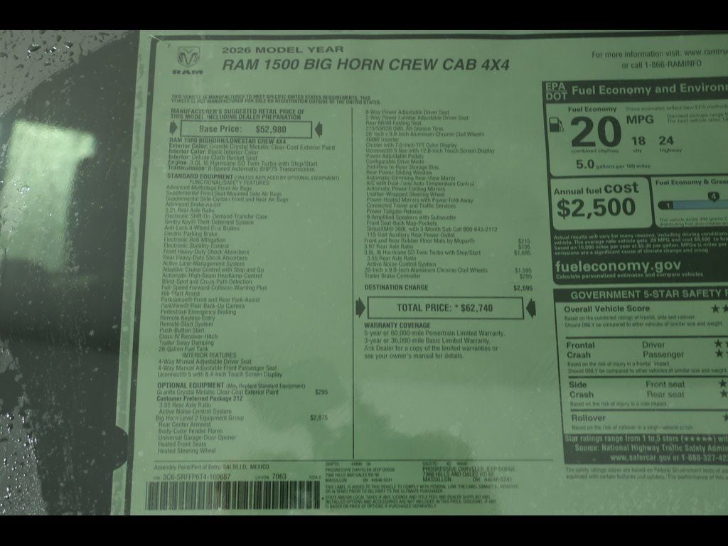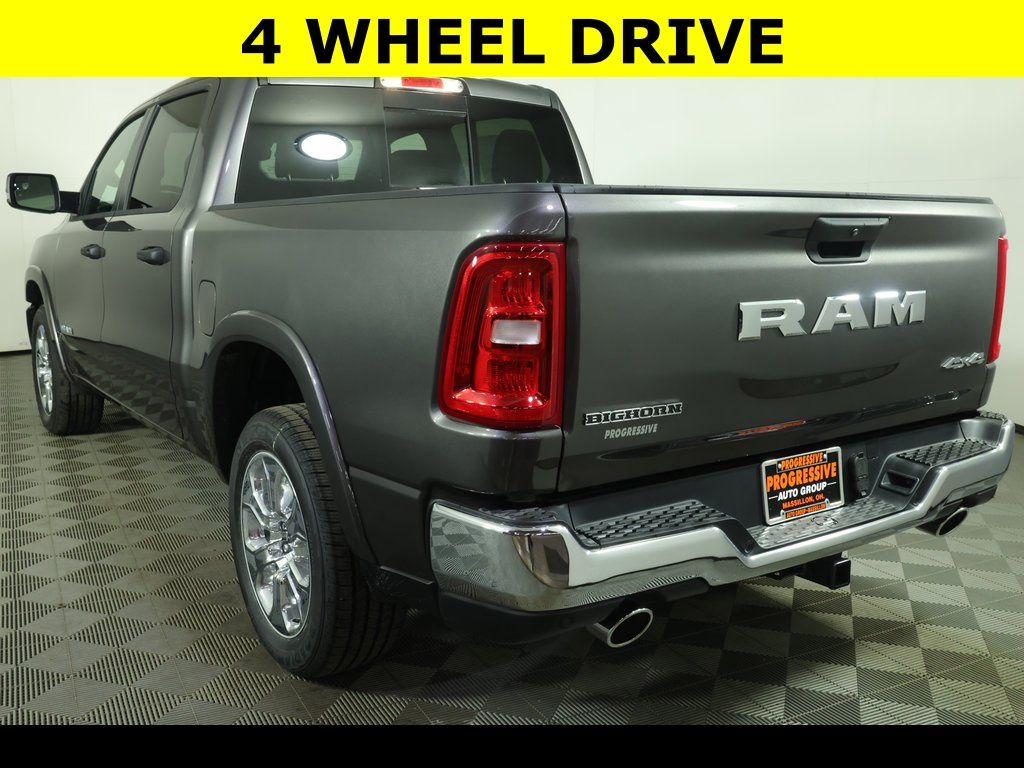 PROGRESSIVE SERVICE RENTAL ** Granite Crystal Metallic Clearcoat 2026 Ram 1500 Big Horn/Lone Star 4WD 8-Speed Automatic 3.0L I6 ** Adaptive Cruise Control, ** All-Wheel Drive, ** Alloy Wheels / Premium Wheels, ** Apple CarPlay/Android Auto, ** Automatic Emergency Braking, ** Backup Camera, ** Blind Spot Monitor, ** Cross Traffic Alert, ** Cruise Control, ** Four-Wheel Drive / 4X4, ** Heated Seats, ** Heated Steering Wheel, ** Keyless Entry, ** Keyless Start, ** Lane Departure Warning, ** Navigation System, ** Premium Sound System / Premium Audio, ** Rear Cross Traffic Alert, ** Remote Start, ** Satellite Radio, ** Stability Control, ** Steering Wheel Controls, ** Tow Hitch / Trailer Hitch, ** USB Port, ** WiFi Hotspot, 115V Auxiliary Power Outlet, 115V Auxiliary Rear Power Outlet, 2nd Row in Floor Storage Bins, 4-Wheel Disc Brakes, 400W Inverter, 4G LTE Wi-Fi Hot Spot, 6 Speakers, 9 Amplified Speakers with Subwoofer, ABS brakes, Air Conditioning, Air Conditioning ATC with Dual Zone Control, AM/FM radio, Apple CarPlay/Android Auto, Auto High-beam Headlights, Auto Power-Folding Mirrors, Auto-Dimming Exterior Driver Mirror, Auto-Dimming Rear-View Mirror, Big Horn Level 2 Equipment Group, Body Color Fender Flares, Brake assist, Cloth Bucket Seats, Compass, Configurable Drive Mode, Connected Travel and Traffic Services, Connectivity - US/Canada, Convex Wide-Angle Exterior Mirror Insert, Delay-off headlights, Deluxe Cloth Bucket Seats, Disassociated Touchscreen Display, Dual front impact airbags, Dual front side impact airbags, Electronic Stability Control, Exterior Mirrors Courtesy Lamps, Exterior Mirrors with Heating Element, Exterior Mirrors with Supplemental Signals, Front Center Armrest w/Storage, Front fog lights, Front reading lights, Front Seat Back Map Pockets, Front wheel independent suspension, Fully automatic headlights, Global Telematics Box Module, Google Android Auto, GPS Antenna Input, GPS Navigation, Heated door mirrors, Heated Front Seats, Heated Steering Wheel, Illuminated entry, Integrated Center Stack Radio, Integrated Voice Command with Bluetooth, Leather Wrapped Steering Wheel, LED Dome Lamp with on/Off Switch, LED Footwell Lighting, Low tire pressure warning, Media Hub with 2 Charge Only USBs, MOPAR Front and Rear Rubber Floor Mats, Occupant sensing airbag, Outside temperature display, Overhead console, Panic alarm, ParkView Rear Back-Up Camera, Passenger vanity mirror, Power Adjust 8-Way Driver Seat, Power Adjustable Pedals, Power door mirrors, Power windows, Premium Overhead Console, Quick Order Package 21Z Big Horn, Radio: Uconnect 5 Navigation with 12.0" Display, Rear 60/40 Folding Seat, Rear Center Armrest, Rear Power Sliding Window, Rear step bumper, Rear Wheelhouse Liners, Rear Window Defroster, Remote keyless entry, Remote Tailgate Release, Security Alarm, SiriusXM with 360L, Speed control, Steering Wheel Mounted Audio Controls, Sun Visors with Illuminated Vanity Mirrors, Tachometer, Telescoping steering wheel, Tilt steering wheel, Traction control, Trip computer, Universal Garage Door Opener, USB Host Flip, Variably intermittent wipers, Voltmeter, Wheels: 20" x 9" Aluminum Chrome Clad.