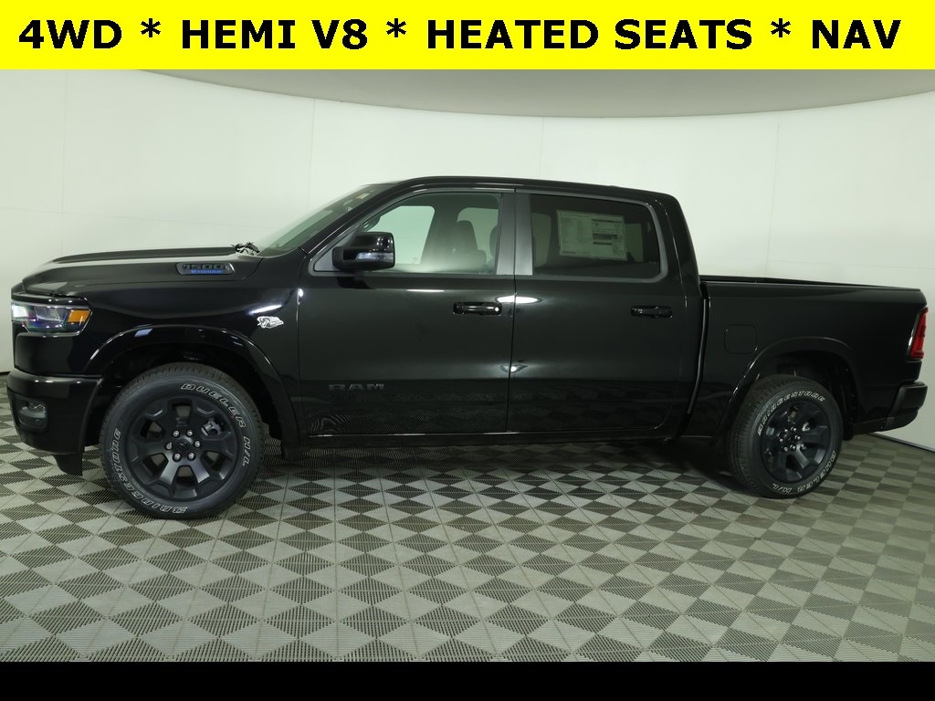 Diamond Black Crystal Pearlcoat 2026 Ram 1500 Big Horn/Lone Star 4WD 8-Speed Automatic HEMI 5.7L V8 Multi Displacement VVT eTorque ** Adaptive Cruise Control, ** All-Wheel Drive, ** Alloy Wheels / Premium Wheels, ** Apple CarPlay/Android Auto, ** Automatic Emergency Braking, ** Backup Camera, ** Blind Spot Monitor, ** Cross Traffic Alert, ** Cruise Control, ** Four-Wheel Drive / 4X4, ** Heated Seats, ** Heated Steering Wheel, ** Keyless Entry, ** Keyless Start, ** Lane Departure Warning, ** Navigation System, ** Premium Sound System / Premium Audio, ** Rear Cross Traffic Alert, ** Remote Start, ** Satellite Radio, ** Stability Control, ** Steering Wheel Controls, ** Tow Hitch / Trailer Hitch, ** USB Port, ** WiFi Hotspot, 115V Auxiliary Power Outlet, 115V Auxiliary Rear Power Outlet, 12" Touchscreen Display, 2nd Row In Floor Storage Bins, 33 Gallon Fuel Tank, 4-Wheel Disc Brakes, 400W Inverter, 4G LTE Wi-Fi Hot Spot, 9 Amplified Speakers w/Subwoofer, ABS brakes, Air Conditioning, Air Conditioning ATC w/Dual Zone Control, AM/FM radio, Anti-Spin Differential Rear Axle, Apple CarPlay/Android Auto, Auto High-beam Headlights, Auto Power-Folding Mirrors, Auto-Dimming Exterior Driver Mirror, Auto-Dimming Rear-View Mirror, Big Horn Level 2 Equipment Group, Black Headlamp Bezels, Black Interior Accents, Body Color Fender Flares, Brake assist, Cloth Bucket Seats, Compass, Configurable Drive Mode, Connected Travel & Traffic Services, Connectivity - US/Canada, Convex Wide-Angle Exterior Mirror Insert, Delay-off headlights, Deluxe Cloth Bucket Seats, Dual Exhaust w/Black Tips, Dual front impact airbags, Dual front side impact airbags, Electronic Stability Control, Exterior Mirrors Courtesy Lamps, Exterior Mirrors w/Heating Element, Exterior Mirrors w/Supplemental Signals, Front fog lights, Front reading lights, Front Seat Back Map Pockets, Front wheel independent suspension, Full Length Floor Console, Fully automatic headlights, Global Telematics Box Module (TBM), Glove Box Lamp, GPS Antenna Input, GPS Navigation, Grille Black Surround Black Mesh, HD Radio, Heated door mirrors, Heated Front Seats, Heated Steering Wheel, Illuminated entry, Integrated Center Stack Radio, Integrated Voice Command w/Bluetooth, Leather Wrapped Steering Wheel, LED Dome Lamp w/On/Off Switch, LED Footwell Lighting, Low tire pressure warning, Manual Folding Exterior Mirrors, Media Hub w/2 Charge Only USBs, Night Edition, Occupant sensing airbag, Outside temperature display, Overhead console, Overhead LED Lamps, Panic alarm, ParkView Rear Back-Up Camera, Passenger vanity mirror, Power Adjust 8-Way Driver Seat, Power Adjustable Pedals, Power door mirrors, Power windows, Premium Overhead Console, Quick Order Package 27Z Big Horn, Radio: Uconnect 5 Nav w/12.0" Display, Rear Power Sliding Window, Rear step bumper, Rear Window Defroster, Remote keyless entry, Remote Tailgate Release, Security Alarm, SiriusXM Radio Service, SiriusXM w/360L, Speed control, Steering Wheel Mounted Audio Controls, Sun Visors w/Illuminated Vanity Mirrors, Tachometer, Telescoping steering wheel, Tilt steering wheel, Traction control, Trip computer, Universal Garage Door Opener, USB Host Flip, Variably intermittent wipers, Voltmeter, Wheels: 20" x 9.0" Aluminum Painted Clad.